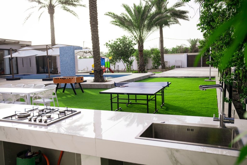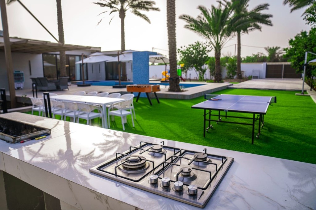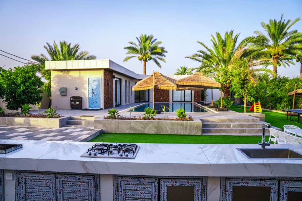 وفرنا لكم في منتجع واحة النخيل كل متطلبات الطبخ والشواء الخارجية حيث تستطيع الان اظهار مهارتك في الطبخ والشواء في المطابخ الخارجية المصممة بتصاميم عصرية والمزودة بكل ما تحتاجه لاتمام طبختكم المفضلة تحت الهواء الطلق